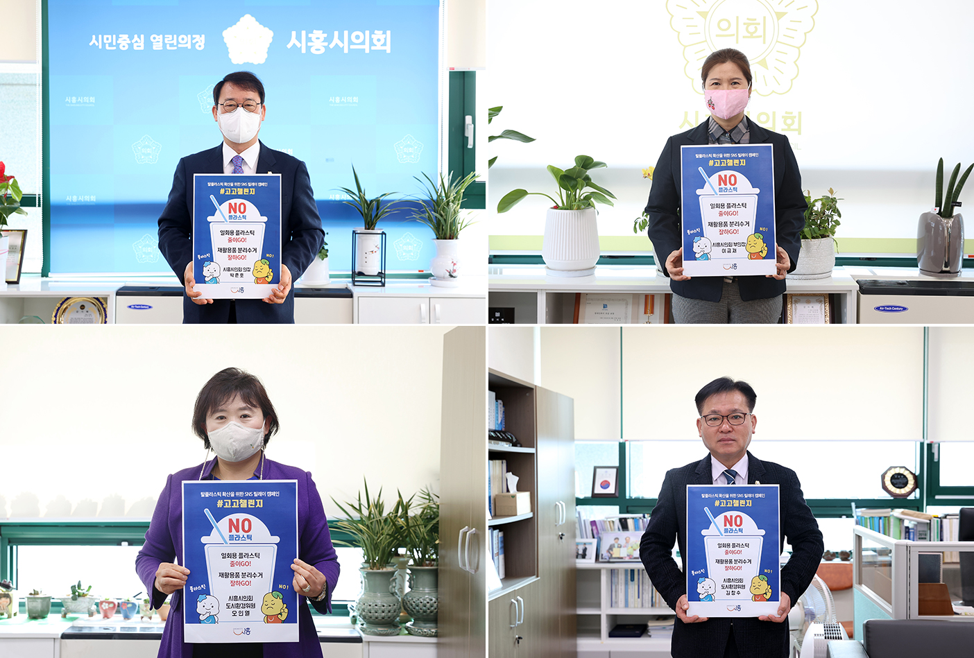 시흥시의회, 탈(脫)플라스틱 '고고챌린지' 동참 경기 시흥시의회 박춘호 의장과 이금재 부의장, 오인열 의원, 김창수 의원이 탈(脫)플라스틱 ‘고고챌린지’에 동참했다. 이번 챌린지는 환경부에서 시작한 SNS 캠페인으로 생활 속 불필요한 플라스틱 사용 감소를 위해 하지 말아야 할 1가지, 해야 할 1가지를 약속하고 다음 주자를 지명하는 방식으로 진행된다. 챌린지에 참여한 시흥시의원들은 ‘일회용 플라스틱 줄이GO! 재활용품 분리수거 잘하GO!’라는 문구가 적힌 팻말을 들고 찍은 사진을 자신의 SNS에 게시했다. 박춘호 의장은 “일상 속 작은 실천들이 모이면 지구를 살릴 수 있다”며 “일회용 컵을 대신해 개인 텀블러를 활용하는 등 탈플라스틱 캠페인에 많은 분들이 동참해주길 바란다”고 말했다. 한편, 시흥시의회는 지난 제277회 제1차 정례회에서 ▲시흥시 1회용품 사용 저감에 관한 조례를 제정하는 등 1회용품 사용 저감 문화 확산을 위해 노력하고 있다.